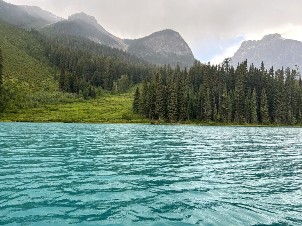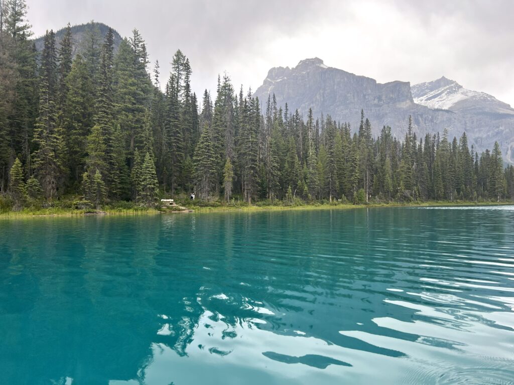 As you approach Emerald Lake, you’ll be struck by its deep turquoise color, which seems almost unreal. After doing a little homework, I found out that the lake’s unique hue is the result of the presence of limestone and dolomite, which are dissolved from the surrounding rocks, creating a striking contrast with the snow-capped mountains that line its shores.