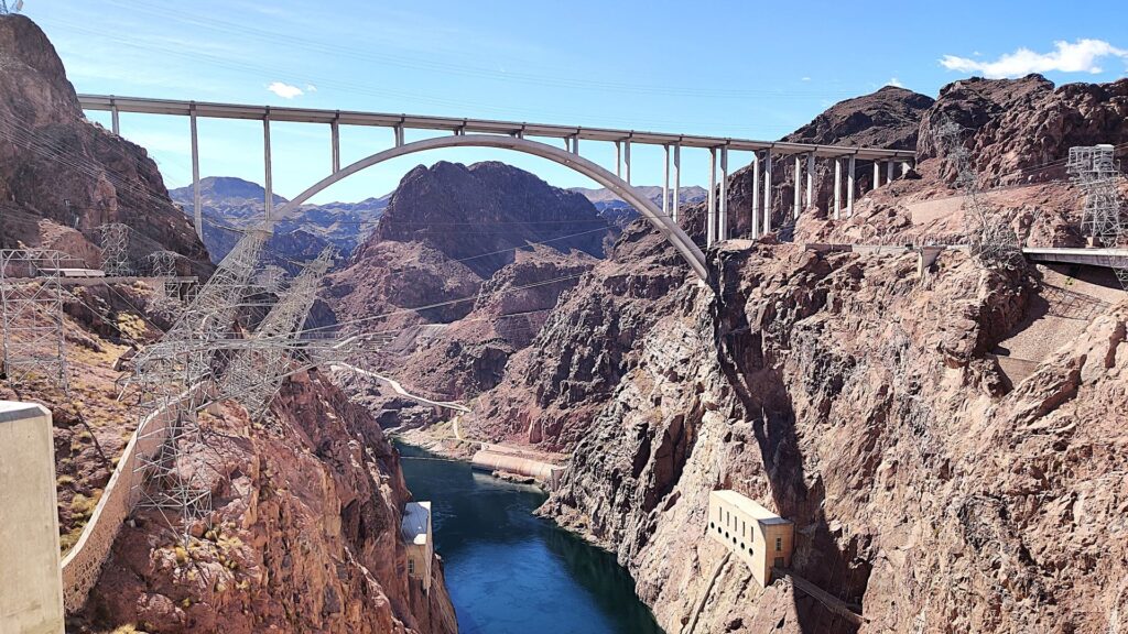 If you are wondering about the bridge towering above the dam, it is the Mike O’Callaghan–Pat Tillman Memorial Bridge. From the Nevada side, a short walk along the pedestrian path leads to sweeping, bird’s-eye views of Hoover Dam and the Colorado River below. It is one of the best spots in the area for photos and offers a completely different perspective on this iconic feat of engineering.
