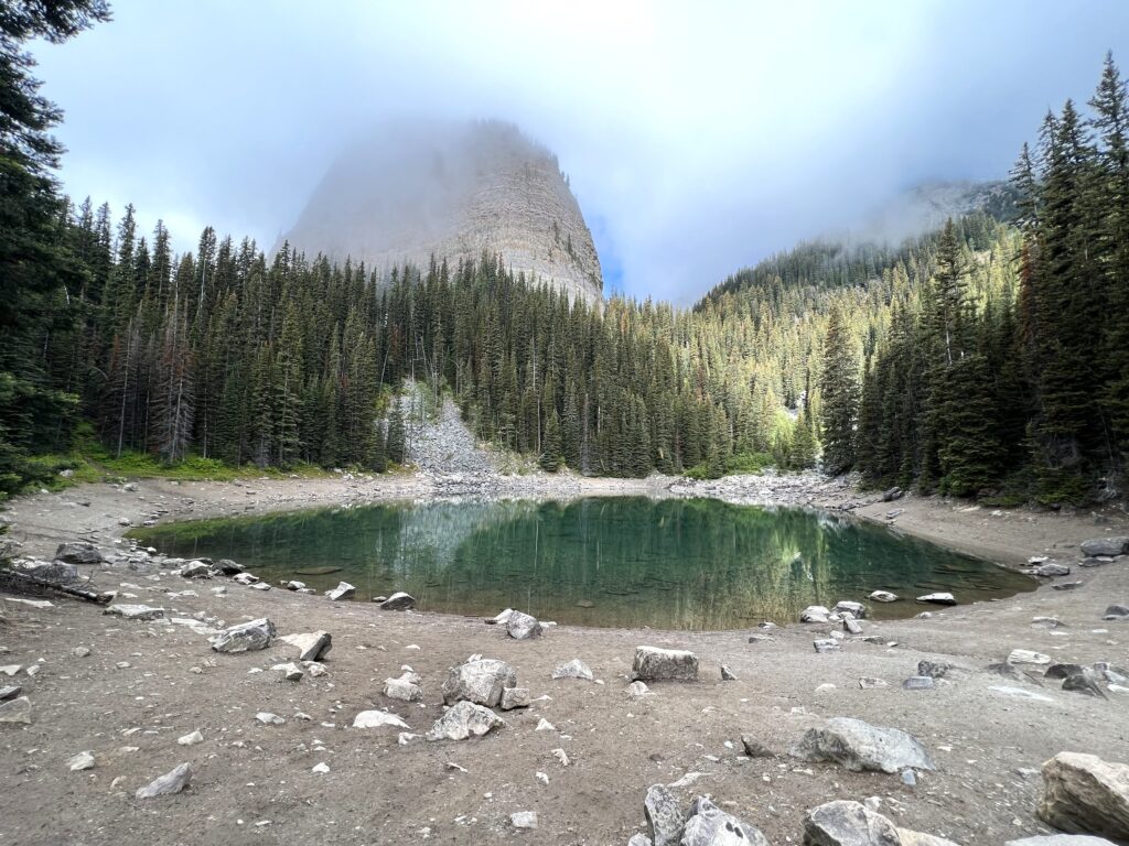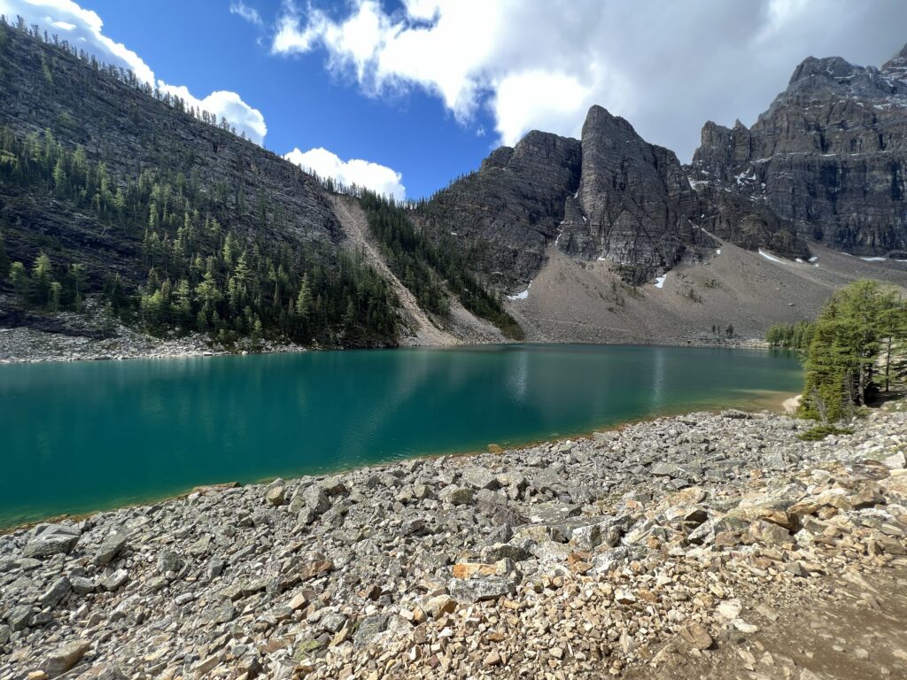 This is the far side of Lake Agnes, you can see the tea house in the background on the left. On the right side is the trail that goes up to the big beehive.,