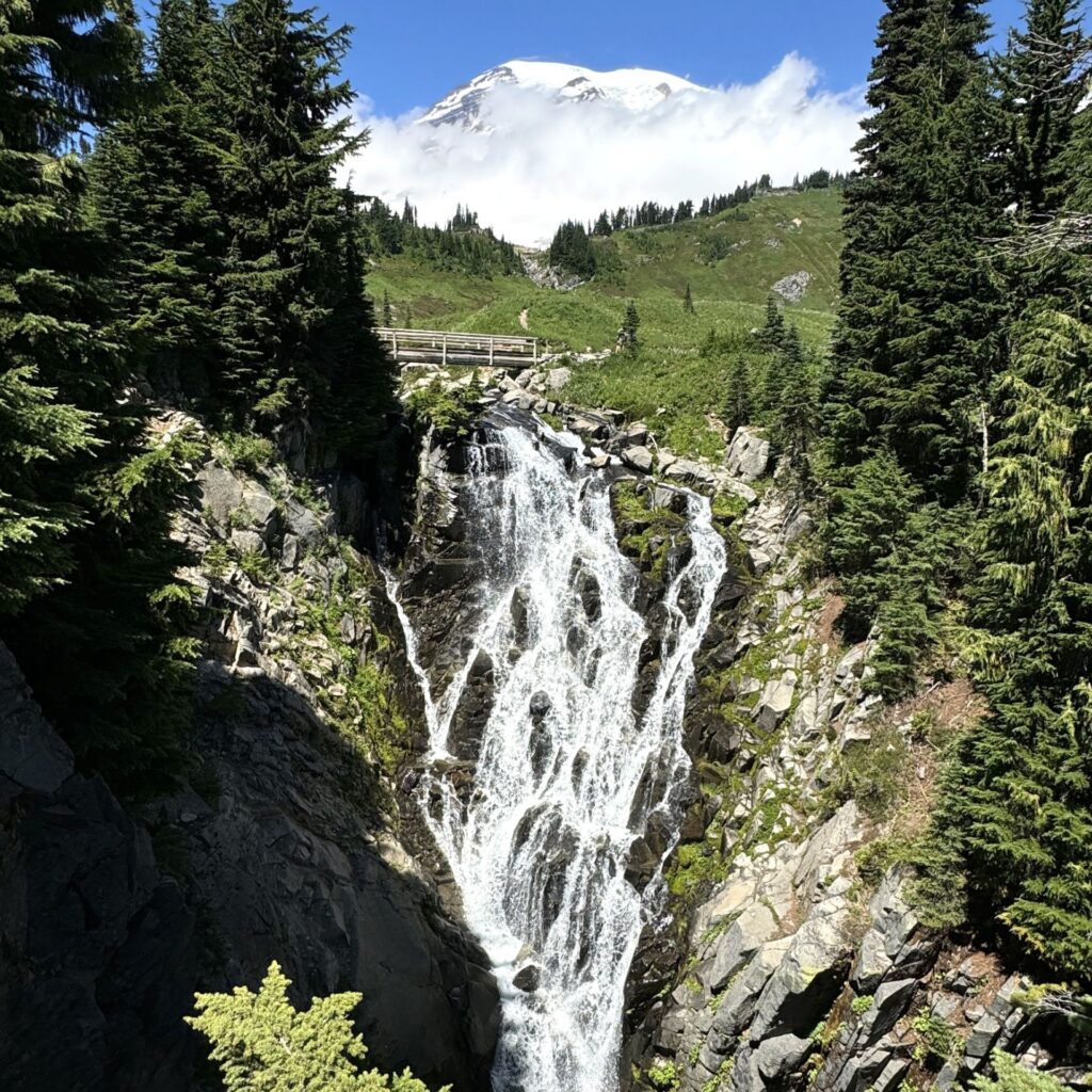 Once we started hiking, we chose to go counter-clockwise on the Skyline Trail, which gradually climbs toward Panorama Point. Our first stop was Myrtle Falls, one of the most accessible and scenic waterfalls in the Paradise area.