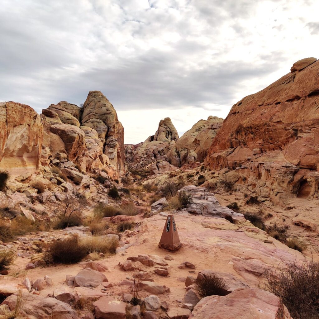 The Rainbow Vista Trailhead is located along the White Domes Road (Mouse’s Tank Road) and is well-marked with a parking area. From the moment you step onto the trail, you’re surrounded by breathtaking rock formations in shades of red, orange, pink, and yellow, giving the landscape a truly painted desert feel.